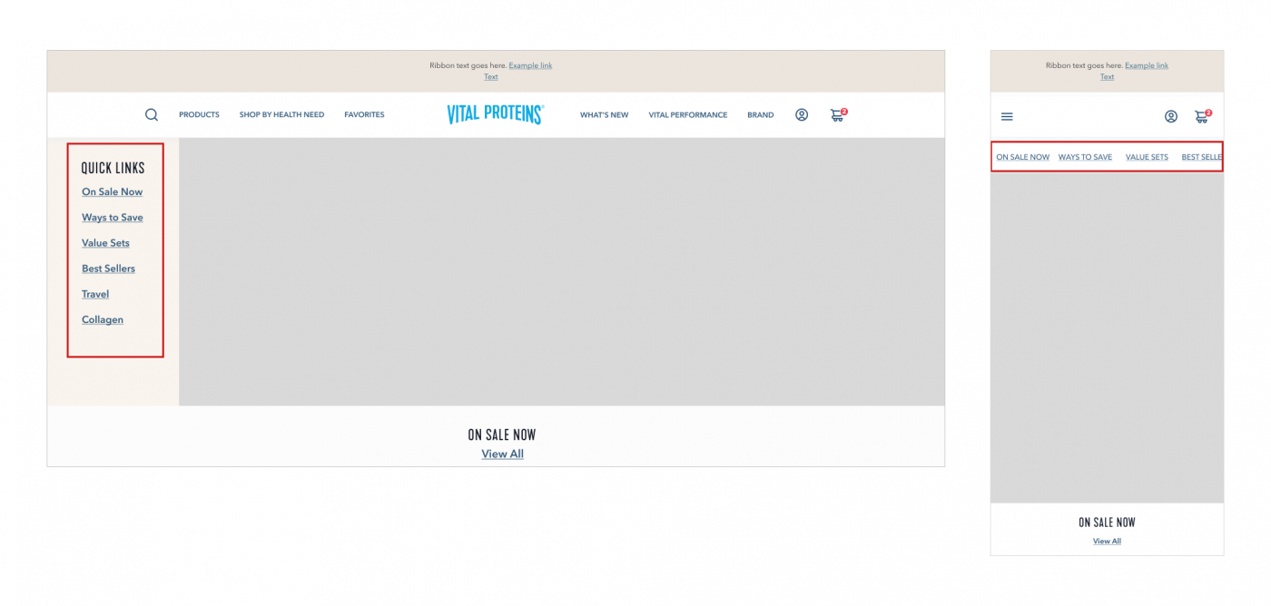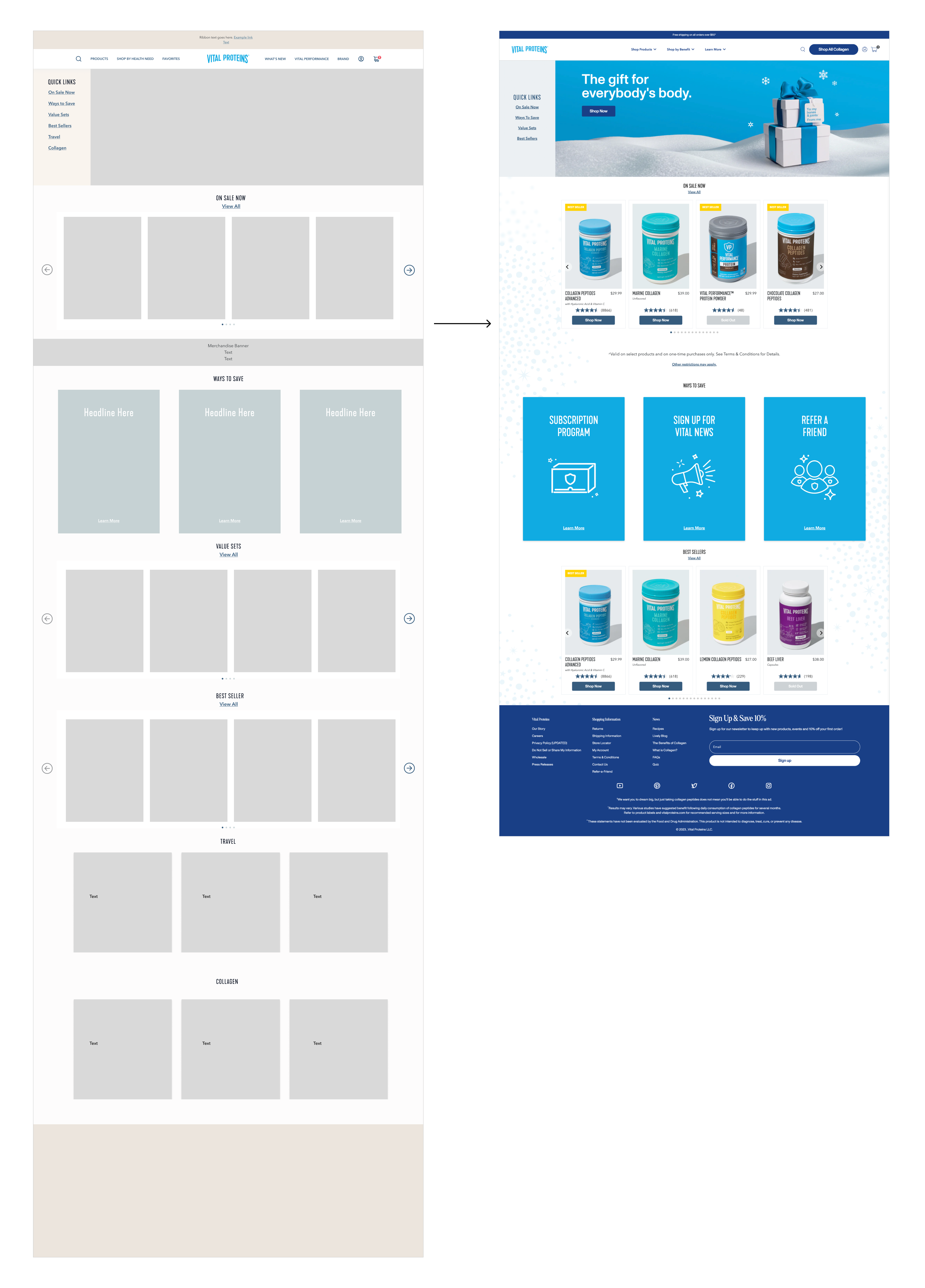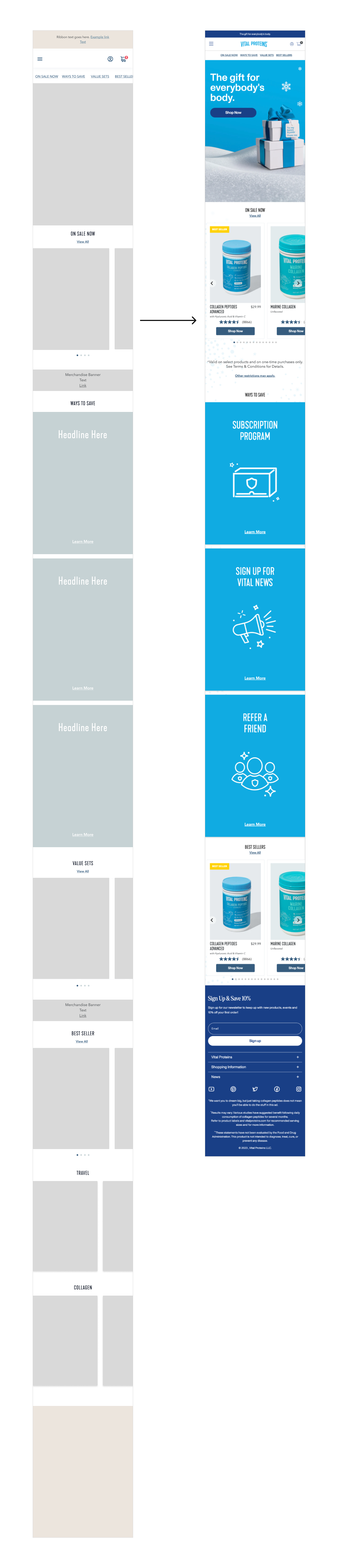 Designed a responsive holiday landing page for Vital Proteins, prioritizing user accessibility and optimizing the purchasing journey with strategically placed quick links for effortless navigation. The page showcases On Sale Items, Ways to Save, Value Sets, Best Sellers, Travel, and Collagen enhancing the overall user experience during the holiday season.