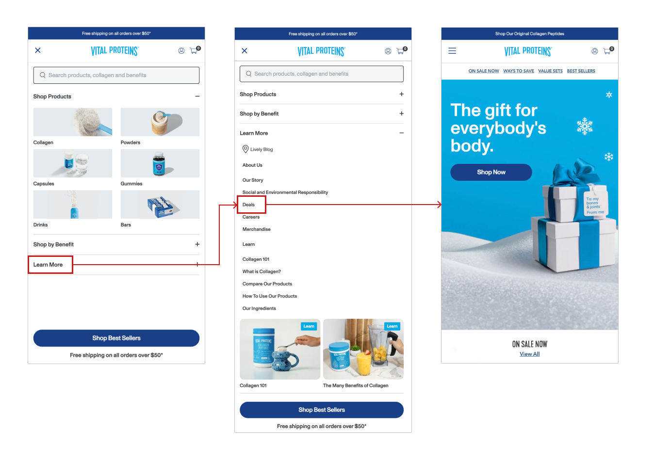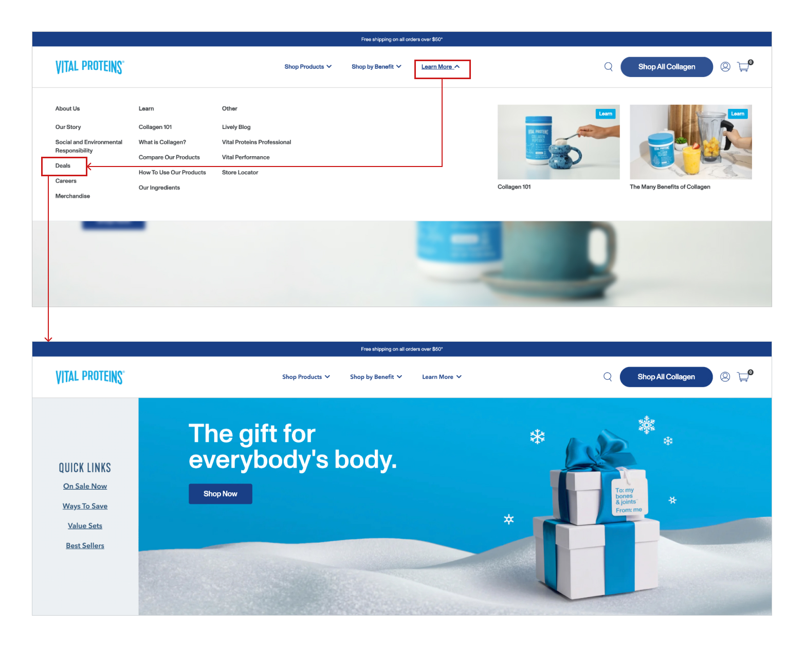 1. Ineffective Deal Showcase: Vital Proteins faces difficulty in effectively presenting all holiday deals and sales items on the homepage.
